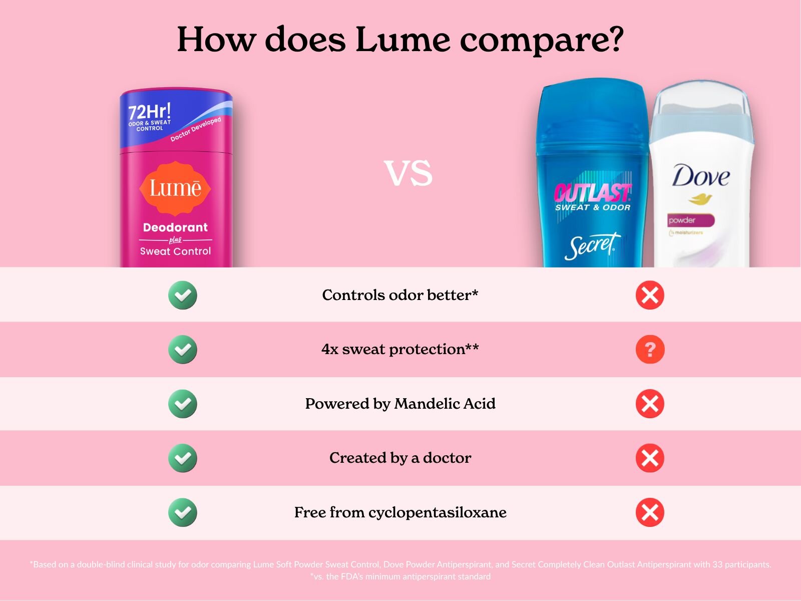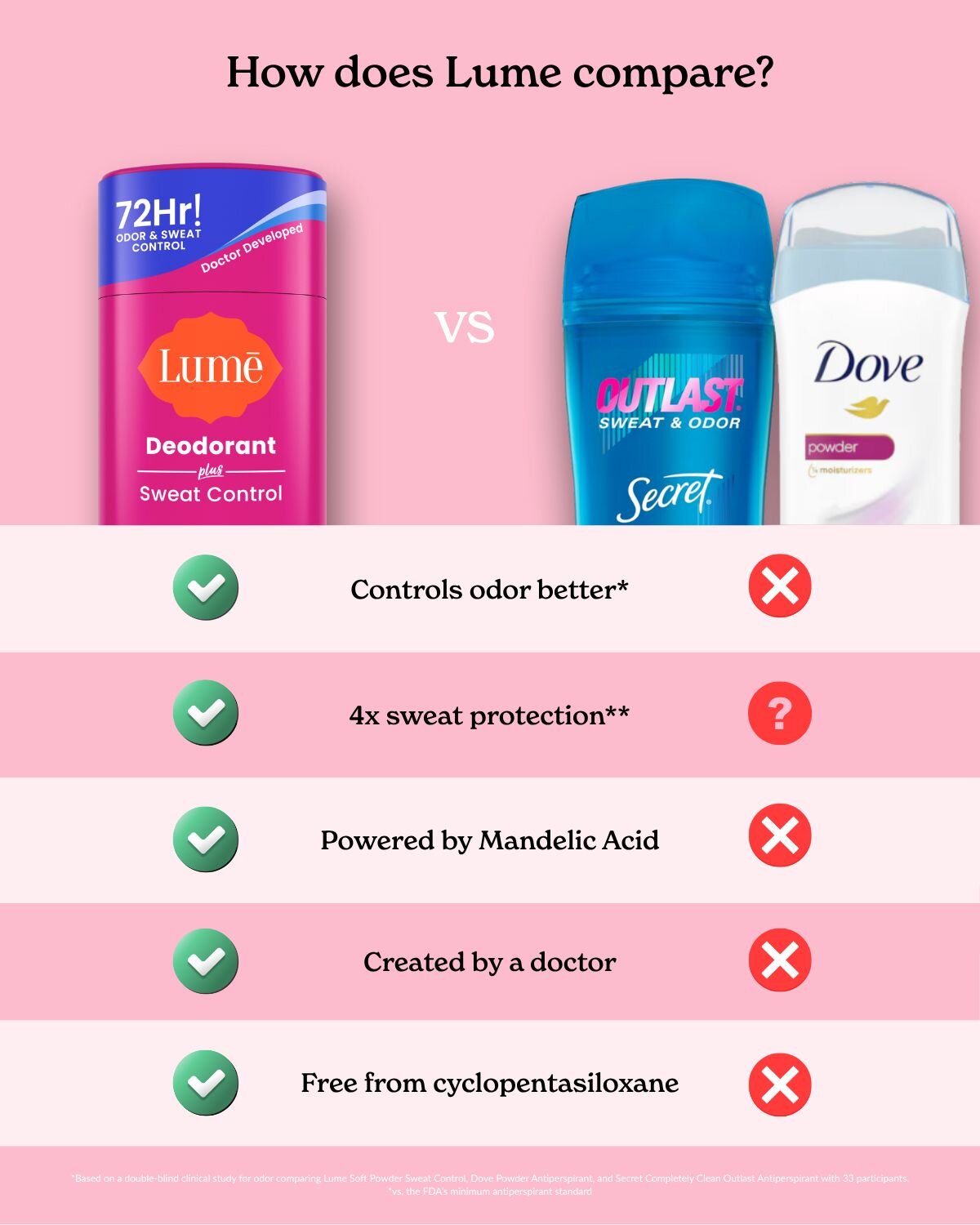 *Based on a double-blind clinical study for odor comparing Lume Soft Powder Sweat Control, Dove Powder Antiperspirant, and Secret Completely Clean Outlast Antiperspirant with 33 participants.
