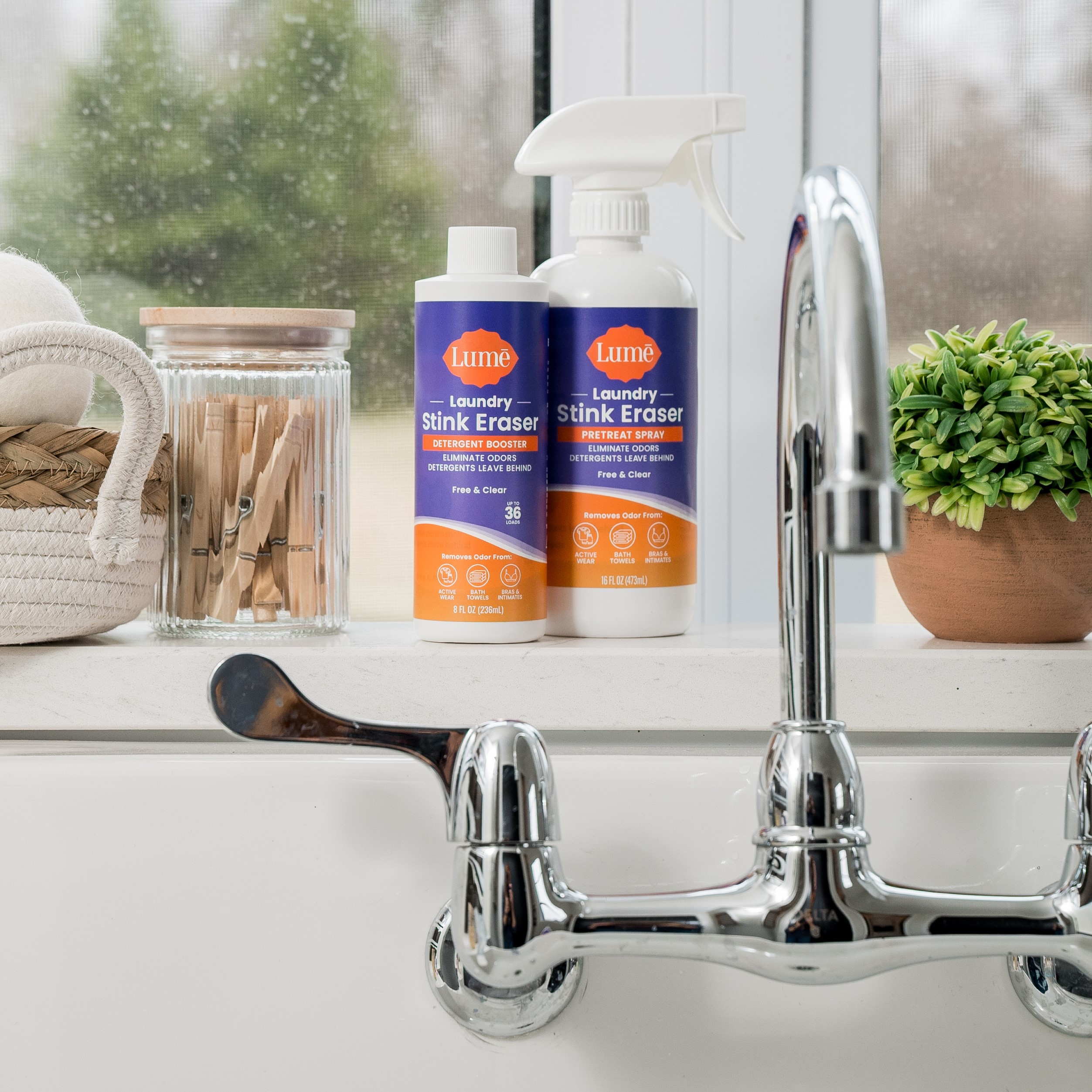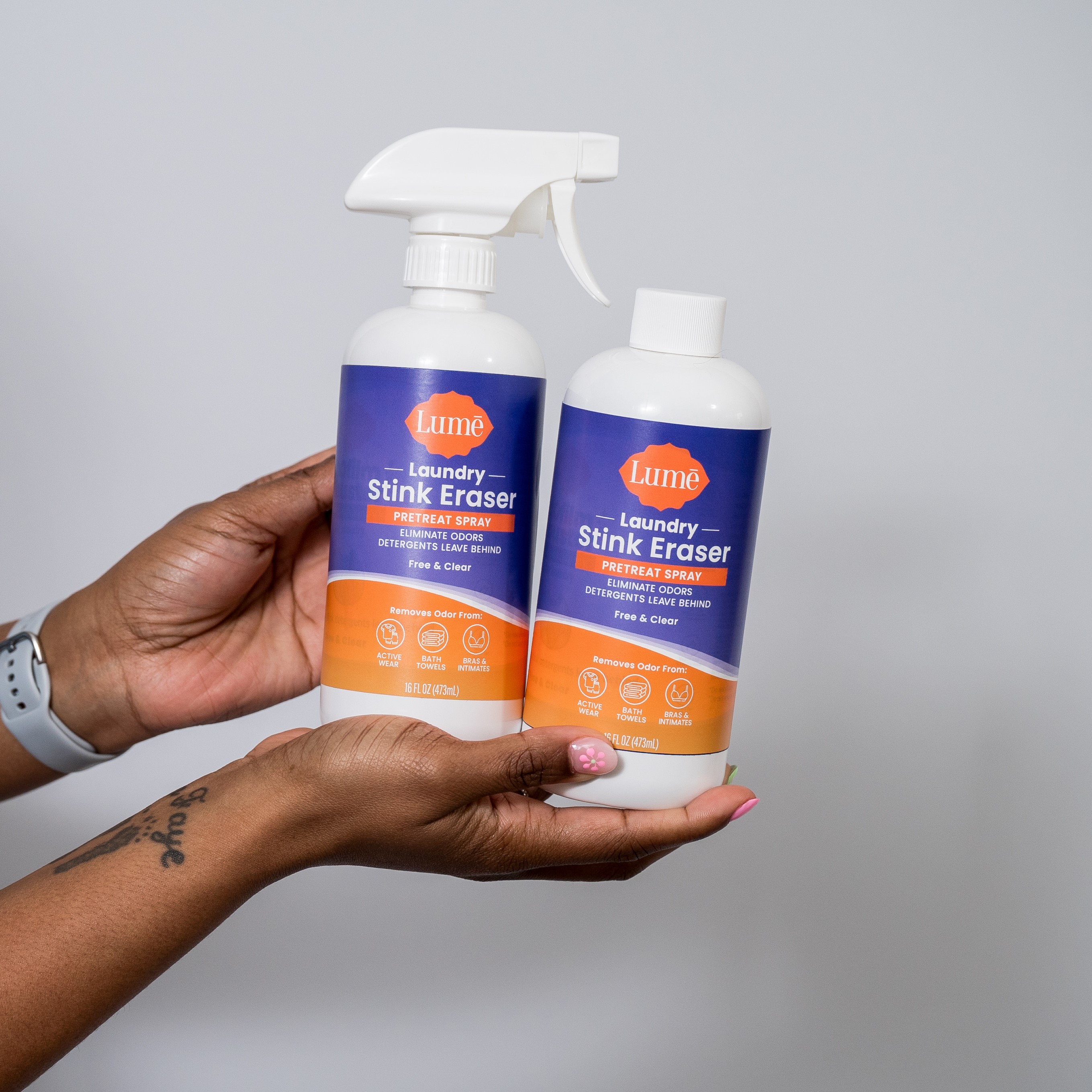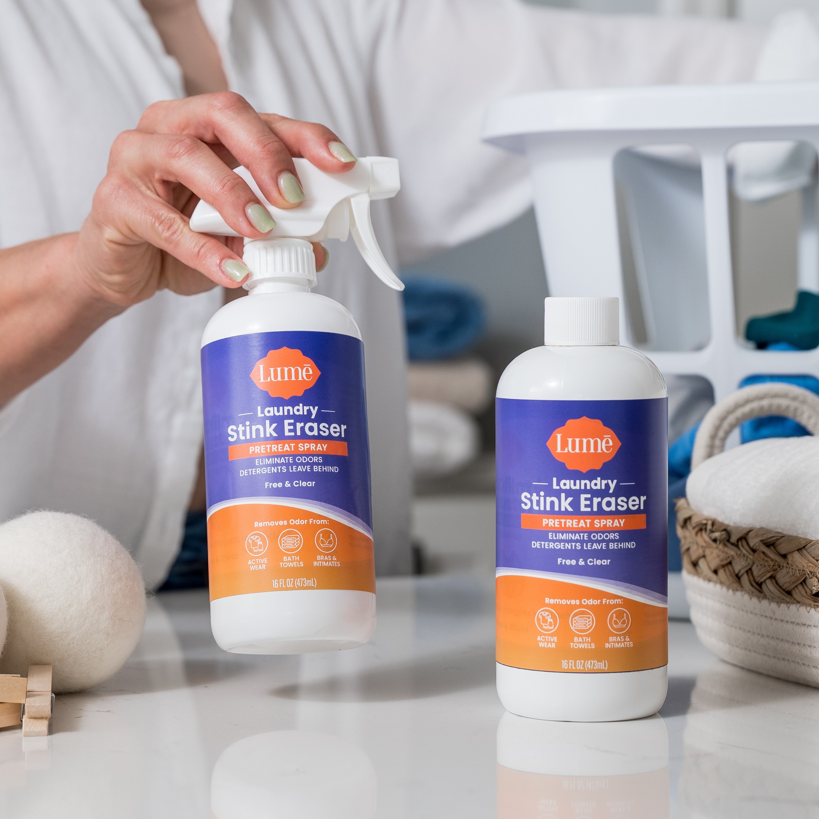 Lume Laundry Stink Eraser is a highly concentrated enzyme blend Pretreat Spray that breaks down odor trapped in clothes so your detergent can wash it away.