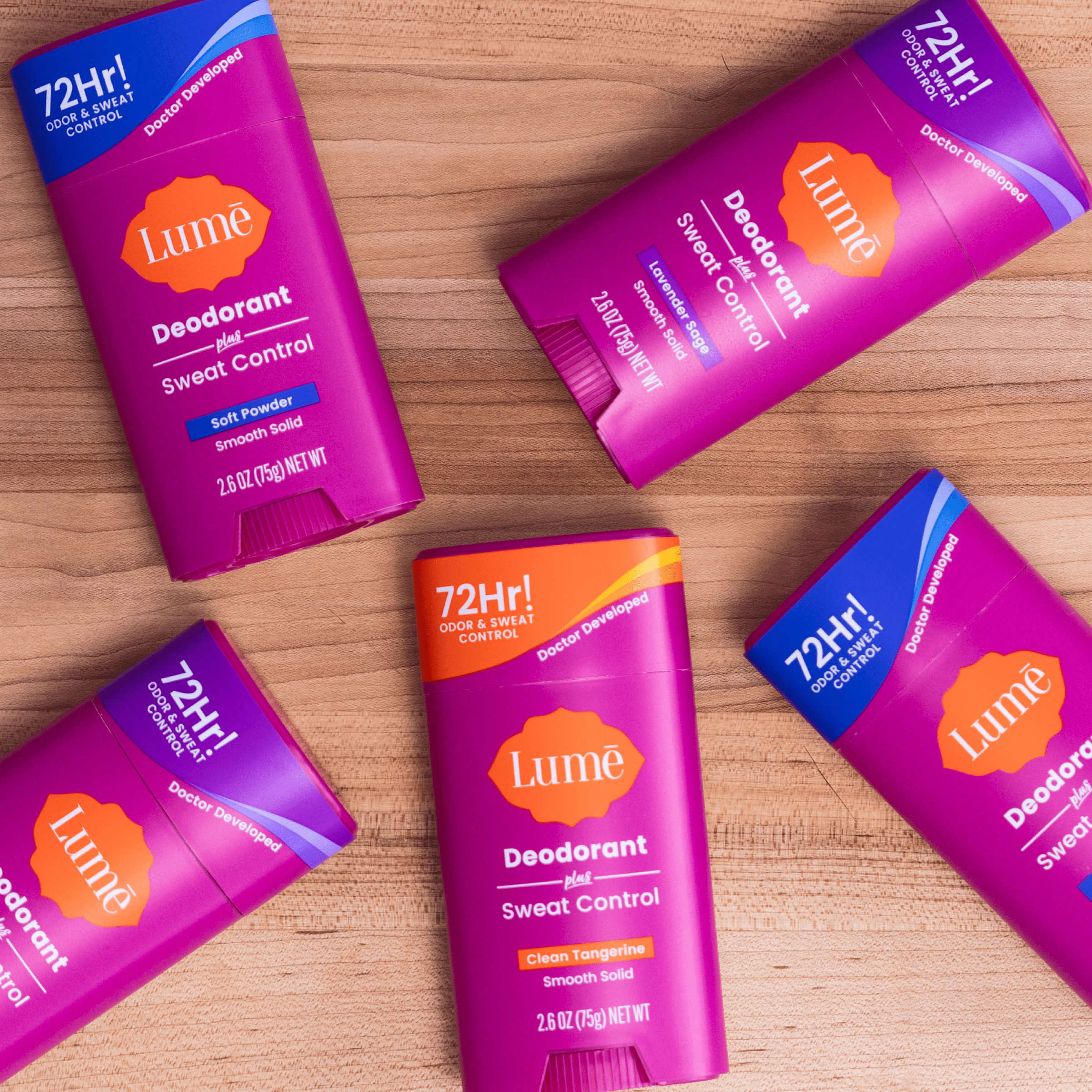 Lume’s new Deodorant + Sweat Control formula delivers powerful, long-lasting protection against both odor and sweat—up to 72 hours. It’s tough where it counts, but still gentle on skin.